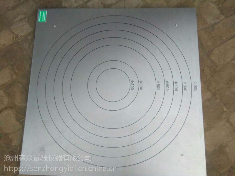 2 底板应为硬质不吸水的光滑正方形平板,边长为1000mm,挠度不**过3mm。在平板表面标出坍落度筒的中心位置和直径分别为500mm、600mm、700mm、800mm及900mm的同心圆,见图A.1.2。